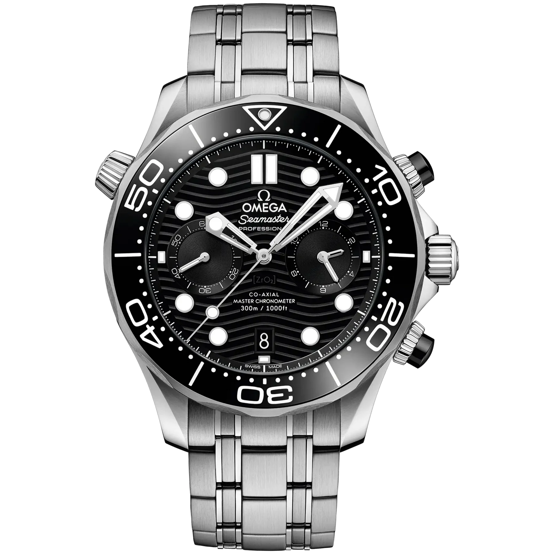 This Omega Seamaster – CO‑AXIAL MASTER CHRONOMETER CHRONOGRAPH watch has a 44mm stainless steel case. This model also features an automatic movement, stainless steel bracelet, sapphire crystal and a Black dial with hands and indexes are filled with white Super-LumiNova. It has a water resistance of 300m